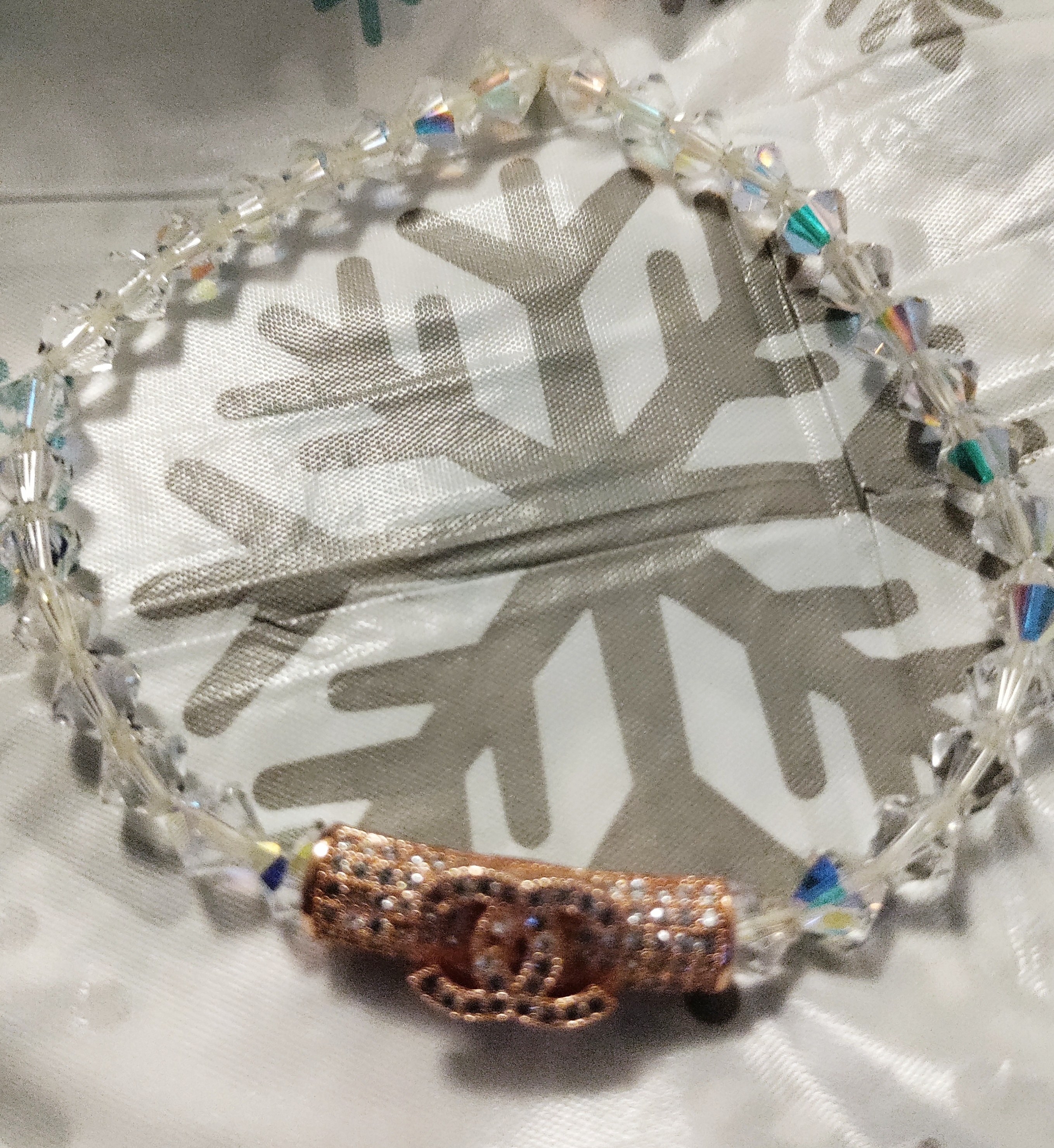 Handmade Beaded Swarovski Crystal and Rose Gold Coco Chanel Crystal Tube, Elastic Bracelet.